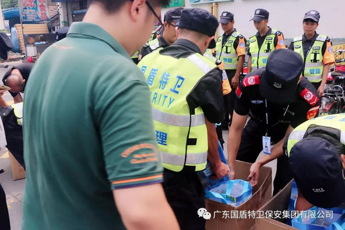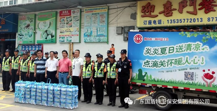 2019年8月23日上午,三水區(qū)總工會(huì)副主席鄺剛?cè)纭⑥k公室主任駱永鋒以及三水區(qū)云東海街道總工會(huì)專職副主席林斌攜工會(huì)工作人員蒞臨國(guó)盾特衛(wèi)保安集團(tuán)總部,為辛勤奮斗在高溫執(zhí)勤一線的保安員代表送上了一批清涼飲料等慰問(wèn)品,送來(lái)了深切祝福和關(guān)懷。