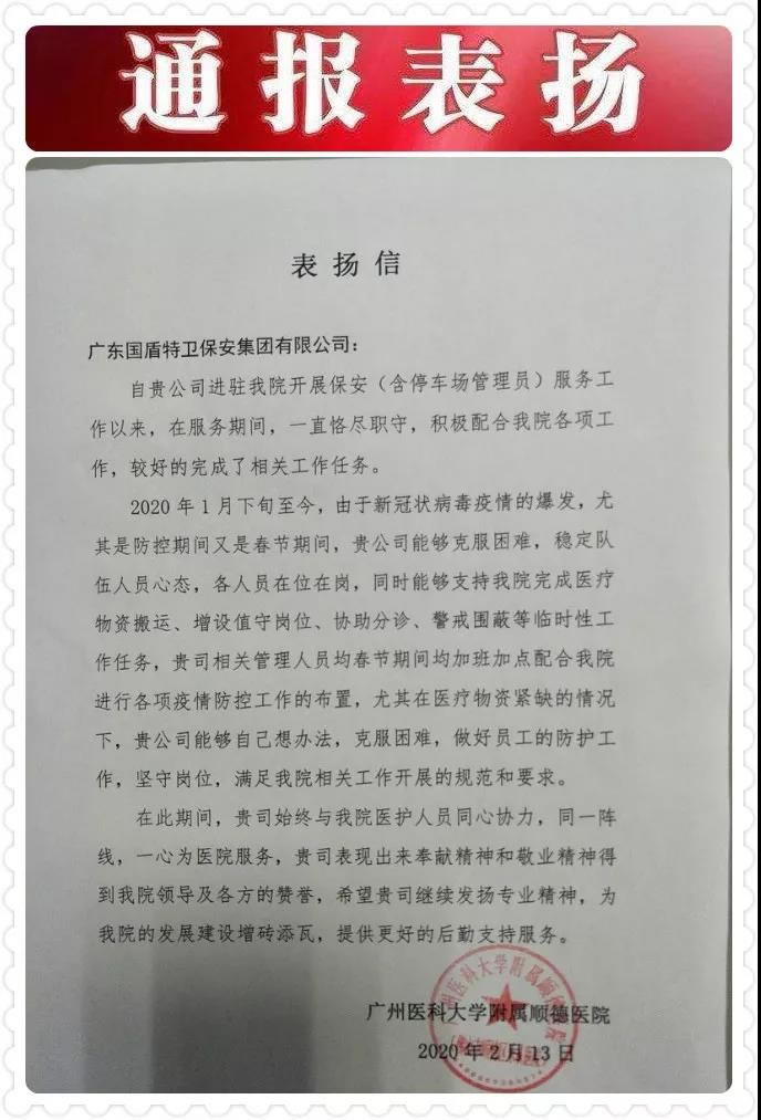 疫情當(dāng)前,我司保安員無論深夜,還是清晨,都一直默默堅守各自崗位護佑平安,始終與醫(yī)護人員同心協(xié)力,打贏這場疫情防控阻擊戰(zhàn)。保安員表現(xiàn)出來的無私奉獻和愛崗敬業(yè)精神,贏得了廣州醫(yī)科大學(xué)附屬順德醫(yī)院領(lǐng)導(dǎo)及各方的一致贊譽。