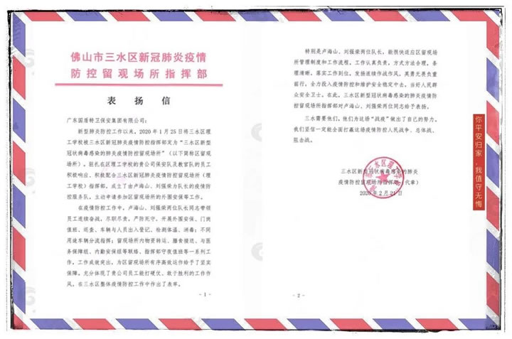 2月22日下午,集團(tuán)公司收到一份來自佛山市三水區(qū)新冠肺炎疫情防控留觀場所指揮部發(fā)來的表揚(yáng)信,高度贊譽(yù)了我司保安員在當(dāng)前疫情防控工作中英勇無畏負(fù)重前行,能打硬仗、連續(xù)奮戰(zhàn)、盡職盡責(zé)、敢于擔(dān)當(dāng)?shù)墓ぷ髯黠L(fēng),在三水區(qū)整體疫情防控工作中作出了表率。