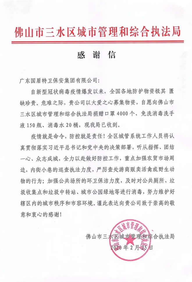 —、廣東國(guó)盾特衛(wèi)保安集團(tuán)有限公司 向三水區(qū)城市管理和綜合執(zhí)法局捐贈(zèng)一批防護(hù)物資