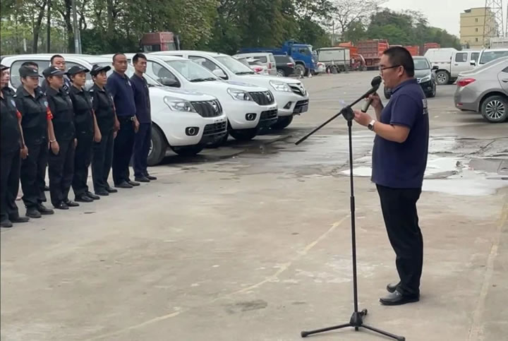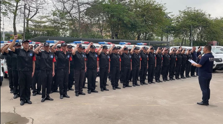 服務管理部部長高永旗率領60名國盾特衛輔助執法隊員列隊集合,并帶頭動員宣誓,用錚錚誓言表達對白坭鎮政府忠誠履職盡責、奮力擔當作為,全力以赴做好城市管理輔助執法工作的堅定決心。