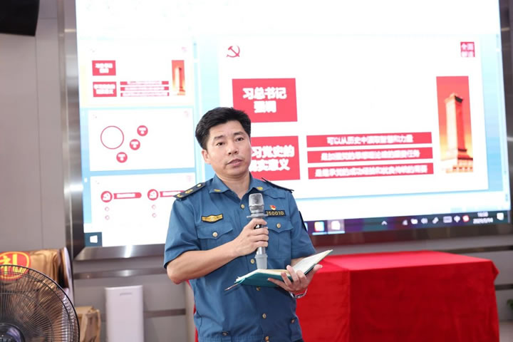 其后,湛江市交通運輸局執法一科科長付雪松同志帶領大家一起回顧了黨的百年發展歷程,共同追憶崢嶸歲月、感悟初心使命,引導黨員切實增強責任擔當,做到知史愛黨、知史愛國,黨中央有號召、共產黨員有行動。付雪松同志講述到:近代以來,在中國和世界舞臺上政黨繁多,難以數計,但是像中國共產黨這樣,成立百年,引領中華民族站起來、富起來、強起來。付雪松科長結合視頻、圖片等資料分別從新民主主義革命時期、社會主義革命和社會主義建設時期、改革開放和社會主義現代化建設時期系統回顧了革命戰爭年代的艱苦創業史和新中國發展壯大的光輝歷程,學習我們黨和國家的基本歷史經驗。付雪松科長強調,2020年突如其來的新冠疫情,是對國家治理體系和治理能力現代化一次大考,在以習近平同志為核心的黨中央堅強領導下,常態化疫情防控和經濟社會發展“雙統籌”穩步走向“雙勝利”,彰顯“中國之治”生動實踐和顯著優勢。