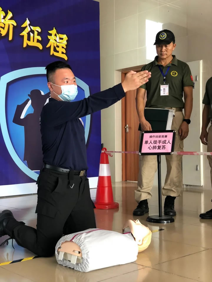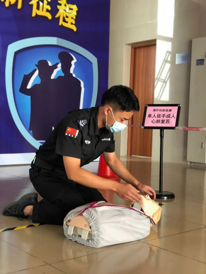 該競賽分為理論知識考核和實操技能考核兩部分。其中,實操技能考核,包括隊列基本動作、現場救護技能(單人徒手成人心肺復蘇)、消防技能(滅火器使用)三項。