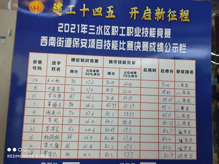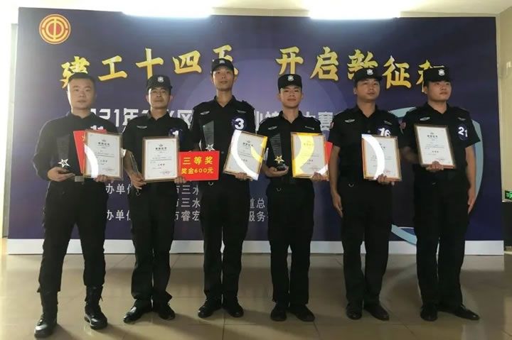 為搭建展示保安職業技能人才才能的平臺,通過技能練兵、比武競賽,培養一批愛國敬業、技藝精湛、具有專門技能的人才, 進一步提升保安從業人員的安全服務技能,推動行業整體服務水平的不斷提高。9月29日, “建功十四五 開啟新征程” — 2021年三水區西南街道保安員職業技能競賽在水都基地職工服務中心舉行。該競賽由佛山市三水區總工會、西南街道總工會主辦,共有12家單位28名保安員選手參賽,我司代表參賽選手龍大標、鄧嘉賢、李志勇、辜操全、李其昆、楊海潮分別獲得一等獎、二等獎、三等獎、優秀獎。