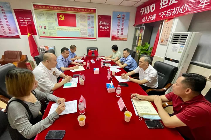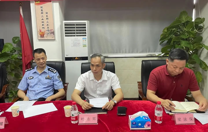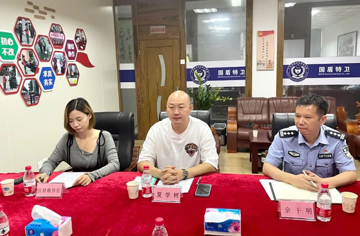 6月7日下午,副區長、區公安分局局長葉永輝在區退役軍人事務局局長梁泳保的陪同下到區禁毒協會、區愛促會會長單位國盾特衛保安集團調研指導工作,區禁毒辦副主任、公安分局副局長朱智耀、區退役軍人事務局副局長董艷群、區公安分局禁毒大隊大隊長余干明、國盾特衛保安集團董事長夏學樹參加了調研座談會。