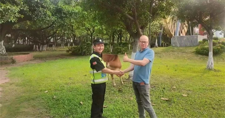 4月20日下午15時33分,我司派駐的協管人員王榮在日常巡查時發現有一頭牛在大塘鎮興唐崗亭附近四處游走、無人看管,疑似農戶丟失。為防止阻礙交通,隊員王榮立即將其牽引到安全位置,并系好牛繩,不讓“迷路”牛再次走丟。同時,為盡快找到失主,防止群眾財產損失,隊員王榮隨后拍下牛的照片,上傳至微信工作群,并將具體情況報告給上級部門負責人。大塘鎮執法辦領導得知此事后,立即聯系鎮農辦相關負責人,讓其協助幫忙將“迷路”牛照片通過微信發送至附近的村委干部幫忙辨認、查找失主。一個小時后,經村民辨認,牛可能是黃某(化名)家的,大塘鎮執法辦立即聯系黃某,經與黃某核對了牛的特征后,確認牛的確是黃某家所丟,隊員王榮將牛歸還給黃某。牽著失而復得的牛,黃某難掩喜悅,連聲道謝。隨后,隊員王榮提醒黃某今后放牛后要多加注意,栓好繩子,避免再次走失。